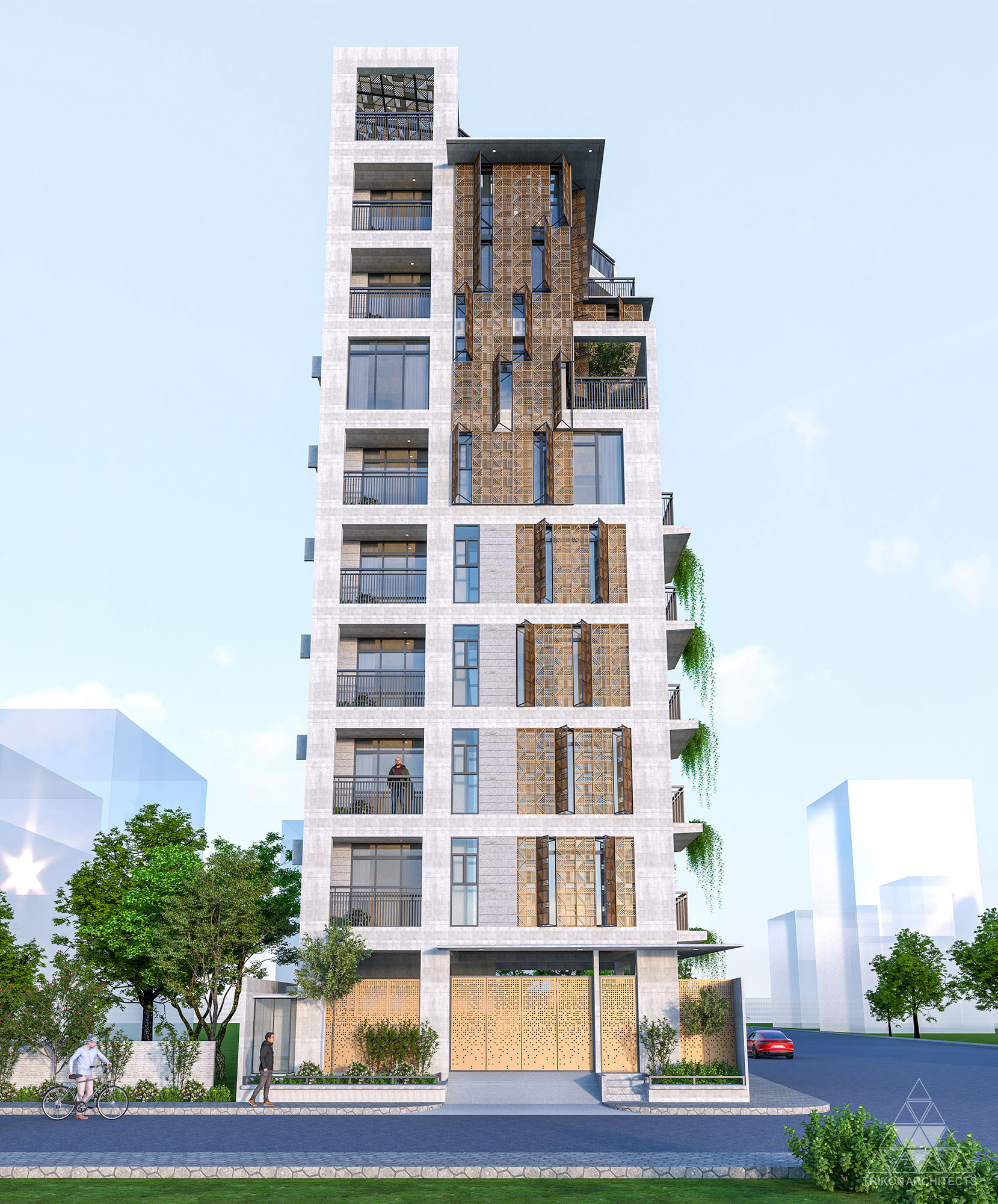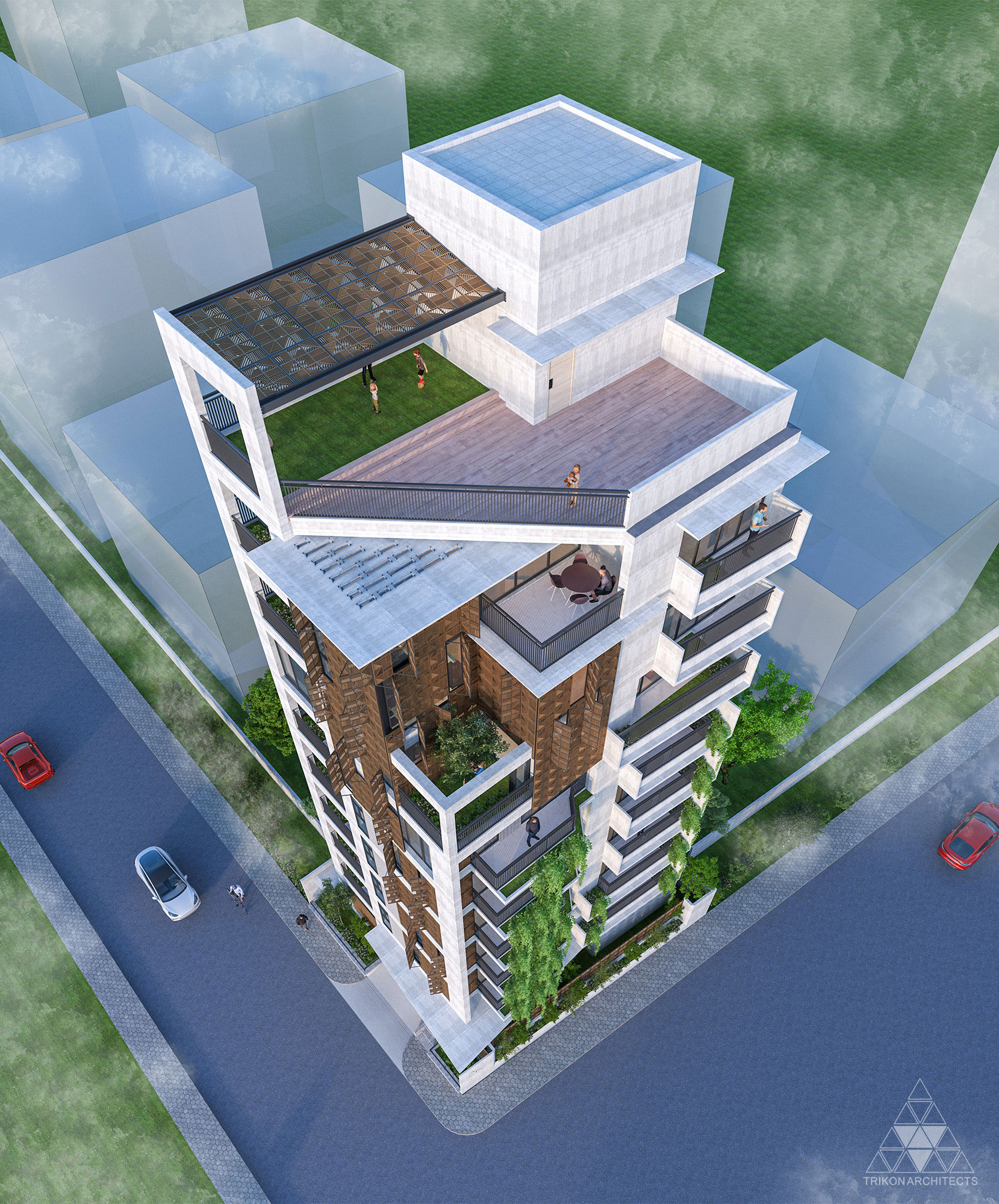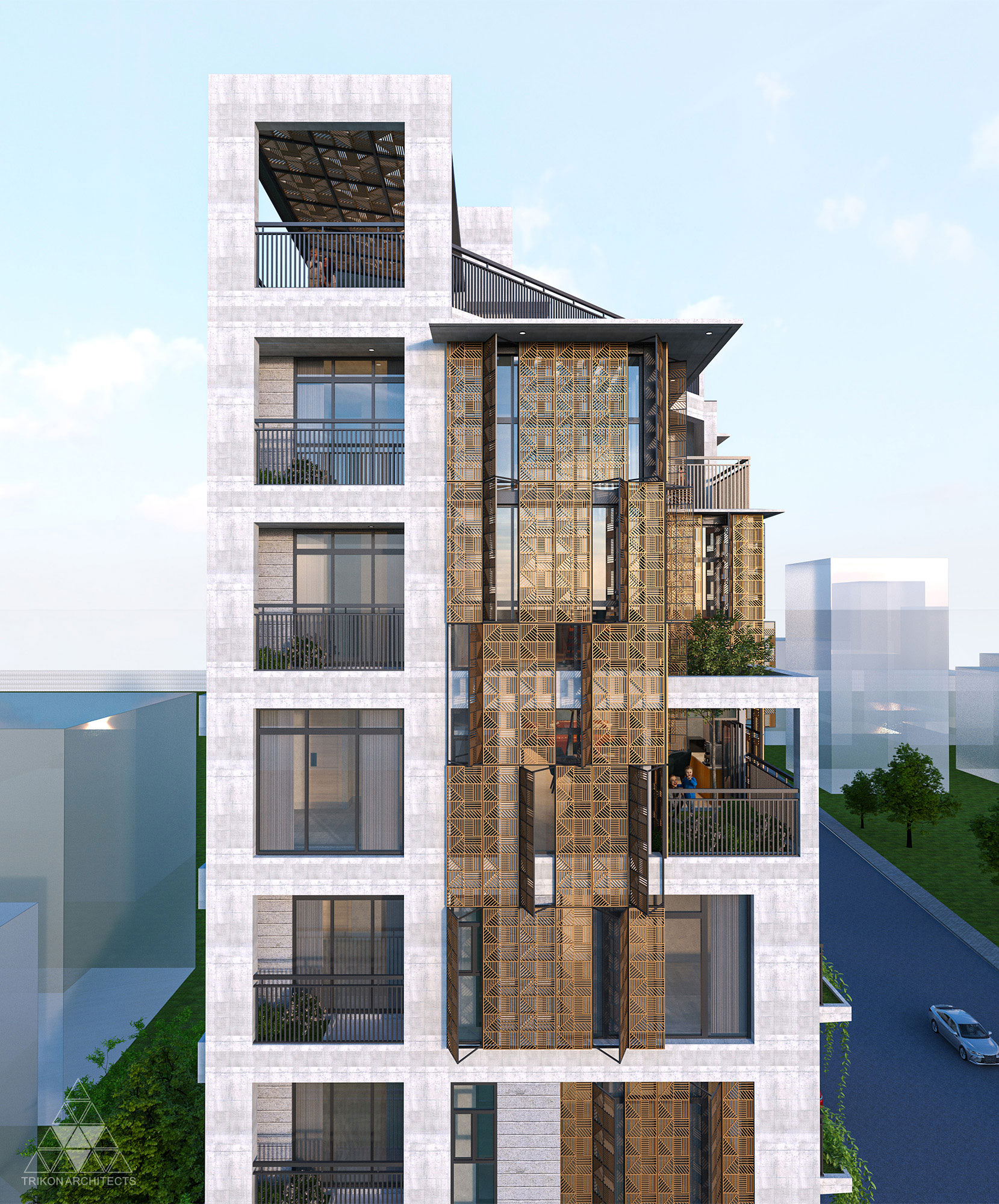 As the site is south-east facing and more susceptible to direct sunlight, it is mitigated by outfitting with innovative shading devices including projected terraces, metal louvres, and roofing to create an appropriate enclosure that lowers solar exposure. Intending to establish a sustainable architectural exemplar, the building is adorned with lush greenery, offering a soothing natural feature effectively helping with cooling the space.